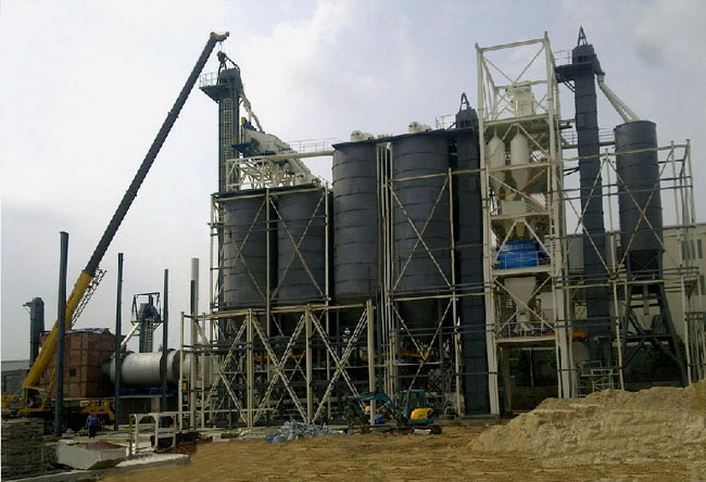 主要由提升輸送系統(tǒng)、計(jì)量配料系統(tǒng)、混合系統(tǒng)、儲(chǔ)料系統(tǒng)、包裝系統(tǒng)、除塵系統(tǒng)、控制系統(tǒng)、鋼架平臺(tái)等組成。