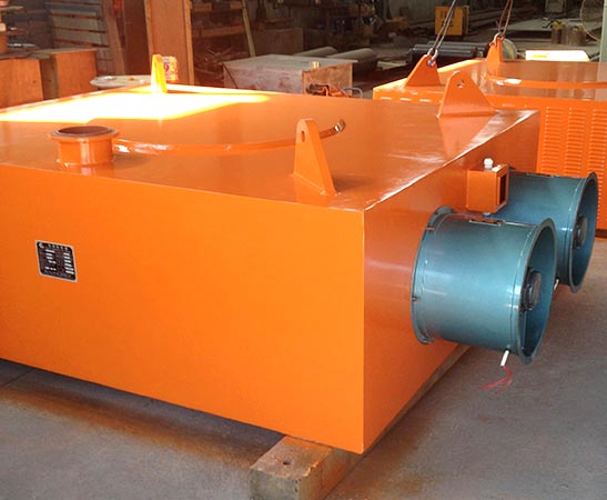 風(fēng)冷電磁除鐵器,采用空調(diào)或軸流風(fēng)機(jī)強(qiáng)迫風(fēng)冷,增加風(fēng)道,增大線路與空氣的接觸面積,改善風(fēng)冷效果。大型除鐵器采用軸流風(fēng)機(jī),風(fēng)壓高,風(fēng)量大,風(fēng)冷效果強(qiáng)。控制柜采用聯(lián)鎖機(jī)構(gòu),即風(fēng)機(jī)一停,除鐵器勵磁立即停電報(bào)警。