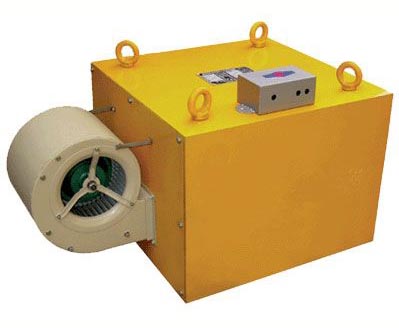 風(fēng)冷電磁除鐵器,采用空調(diào)或軸流風(fēng)機(jī)強(qiáng)迫風(fēng)冷,增加風(fēng)道,增大線路與空氣的接觸面積,改善風(fēng)冷效果。大型除鐵器采用軸流風(fēng)機(jī),風(fēng)壓高,風(fēng)量大,風(fēng)冷效果強(qiáng)??刂乒癫捎寐?lián)鎖機(jī)構(gòu),即風(fēng)機(jī)一停,除鐵器勵(lì)磁立即停電報(bào)警。